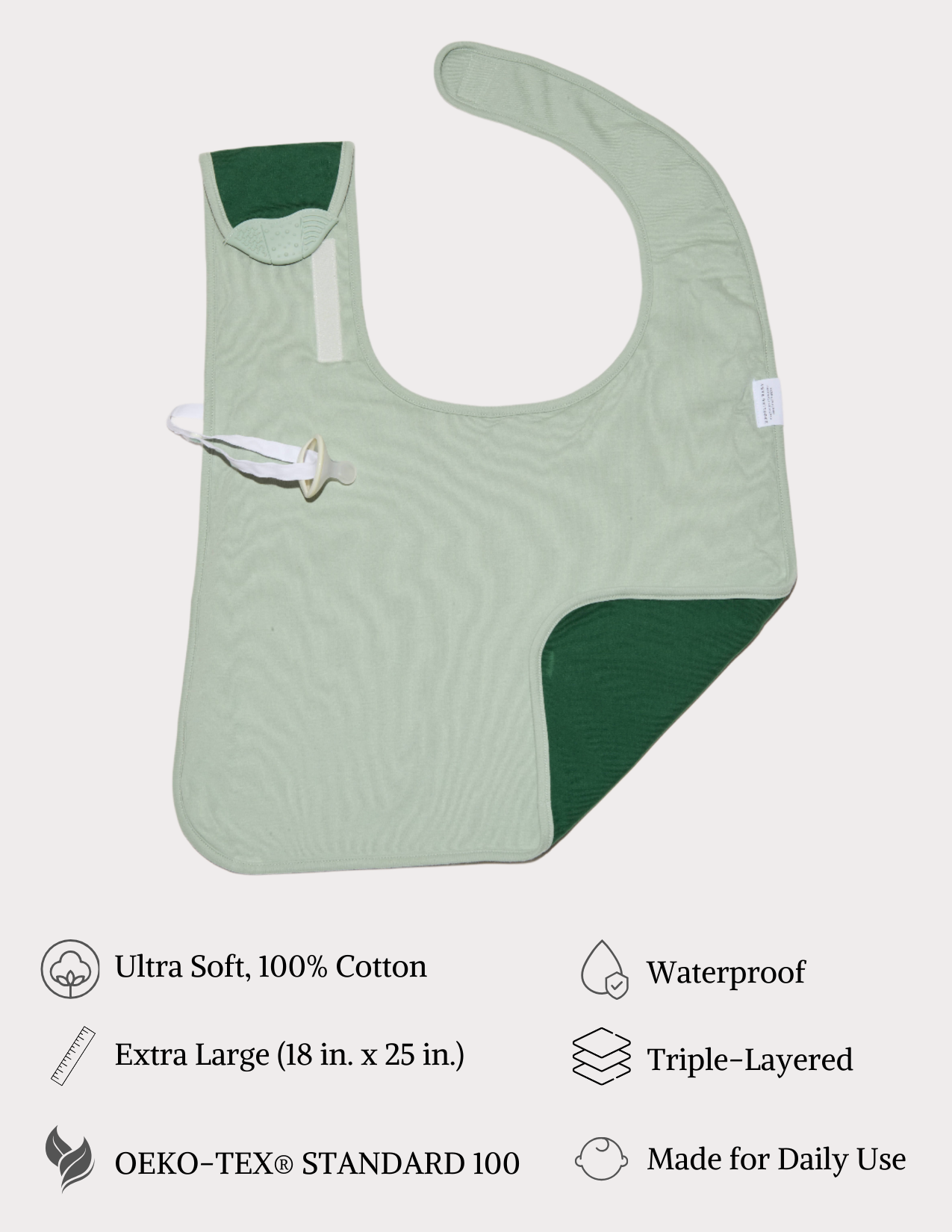 Designed for parents by parents, Drooling Baby features extended chest and over-the-shoulder coverage, a baby teething piece, and a strap to hold paci or to secure the burp cloth when not in use.